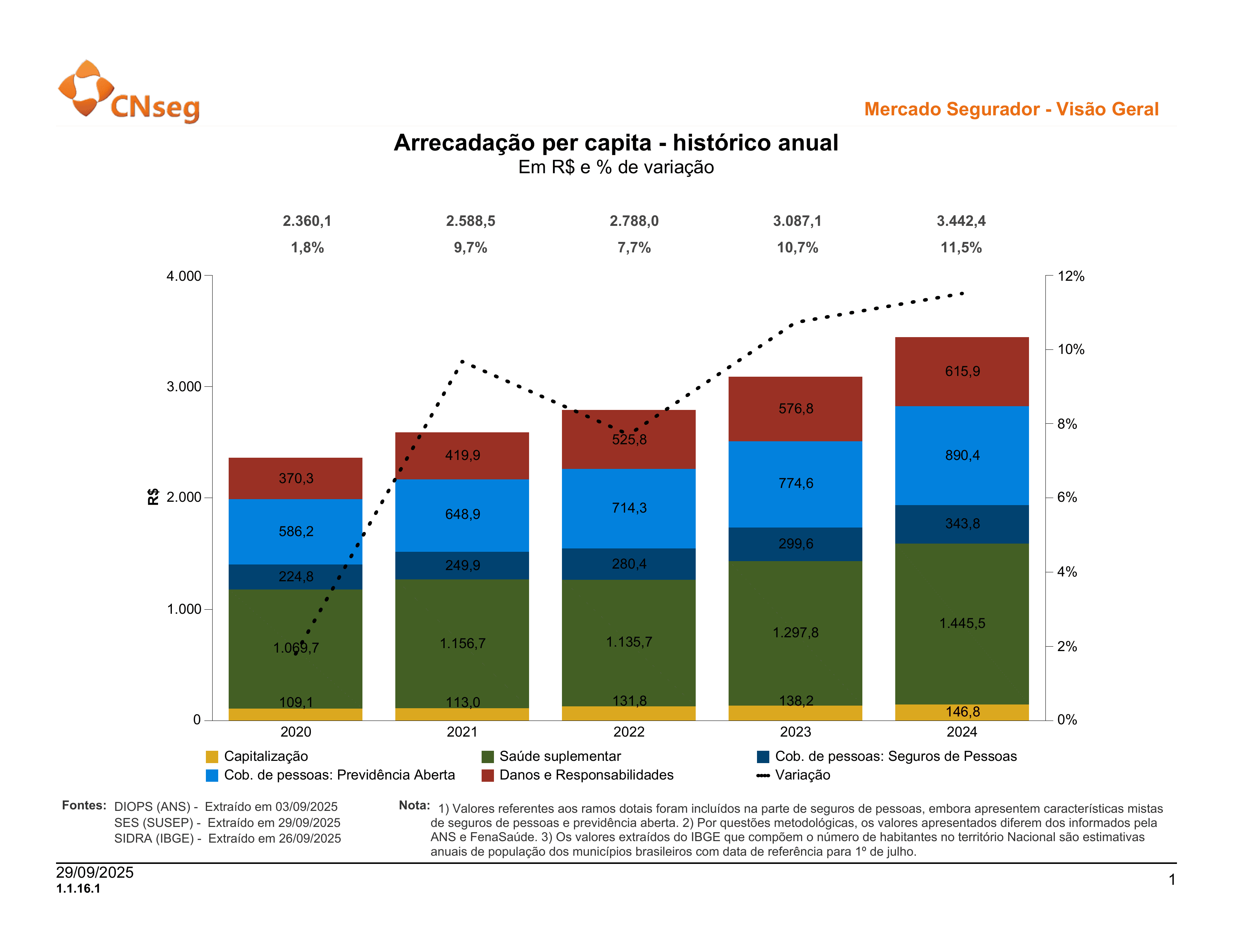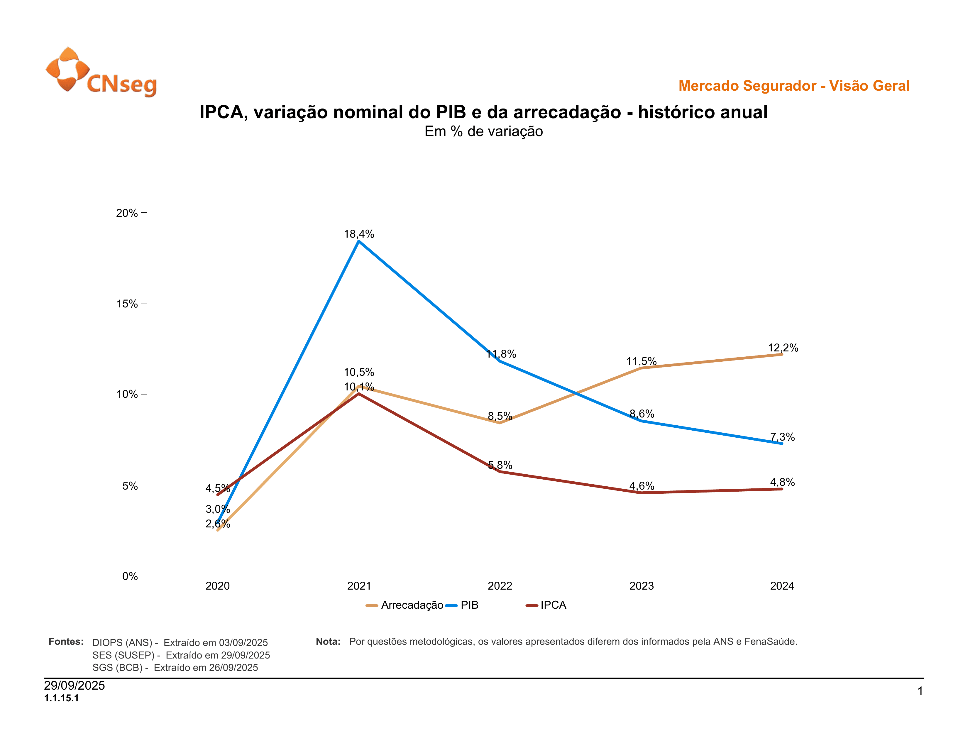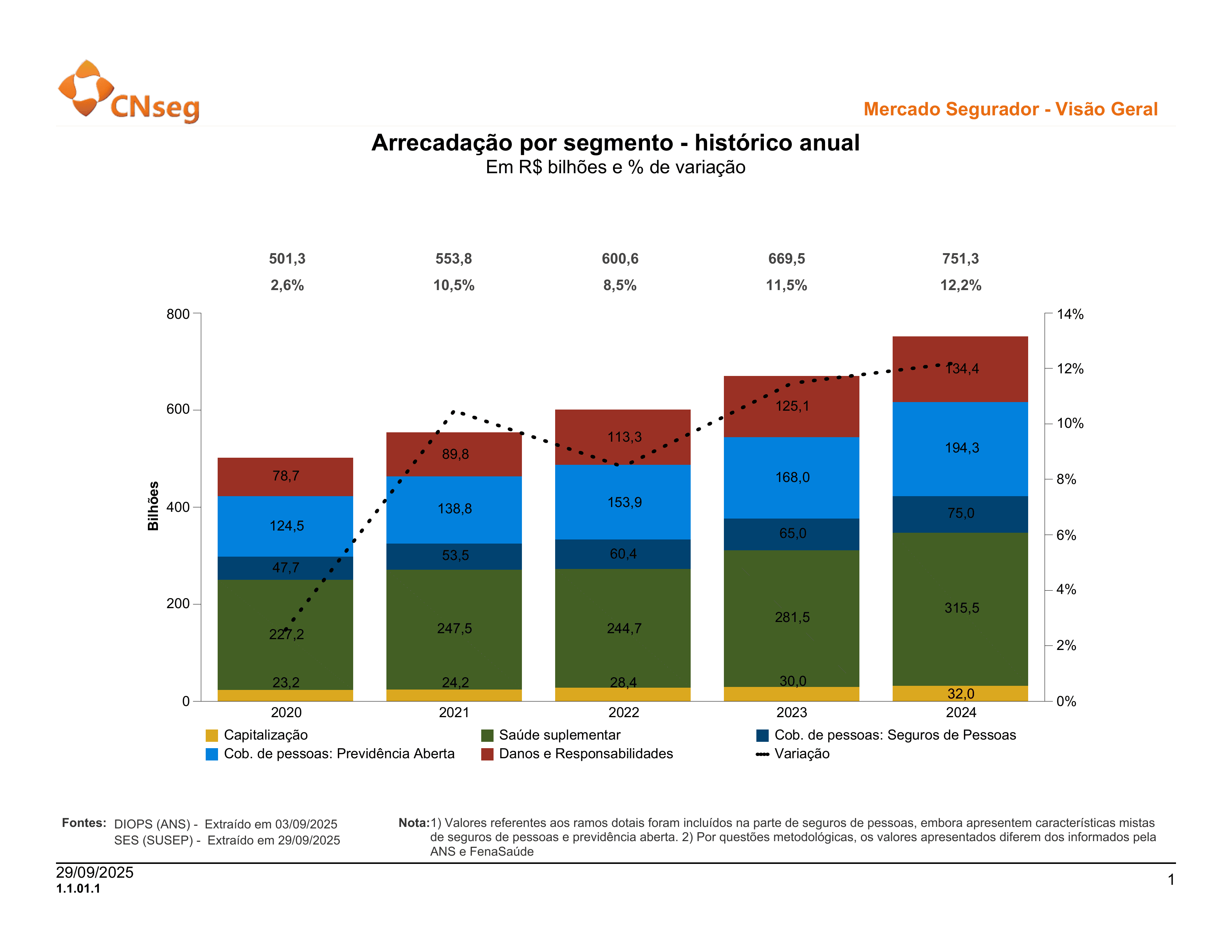 Este breve resumo estatístico exibe informações relevantes sobre o Mercado Segurador e seus diversos segmentos, a partir de dados públicos da SUSEP e ANS, além de fontes auxiliares como BCB e IBGE. Estas informações serão atualizadas periodicamente, sempre que houver a divulgação de novos dados pela Susep ou ANS. Estatísticas mais detalhadas de cada segmento são encontradas em área equivalente do sítio eletrônico da FenSeg, FenaPrevi, FenaSaúde e FenaCap, conforme o caso.