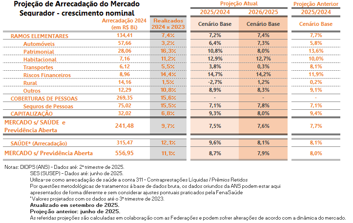 Nessa nova fase, utiliza-se metodologia e modelagem mais adequadas às realidades do Mercado Segurador. As projeções são o resultado do esforço conjunto entre a Suesp e as Federações associadas à CNseg. Incorporam não só estudos estatísticos que consideram fatores externos ao Mercado Segurador (são utilizadas mais de 50 variáveis macro e socioeconômicas), mas também a expertise de técnicos de cada um dos setores. No período entre maio de 2016 e março de 2022, as projeções eram apresentadas com cenários pessimistas e otimistas, entretanto, a partir de agosto de 2022, passaram a ser apresentadas apenas com cenário base sob a ótica político-econômica brasileira.